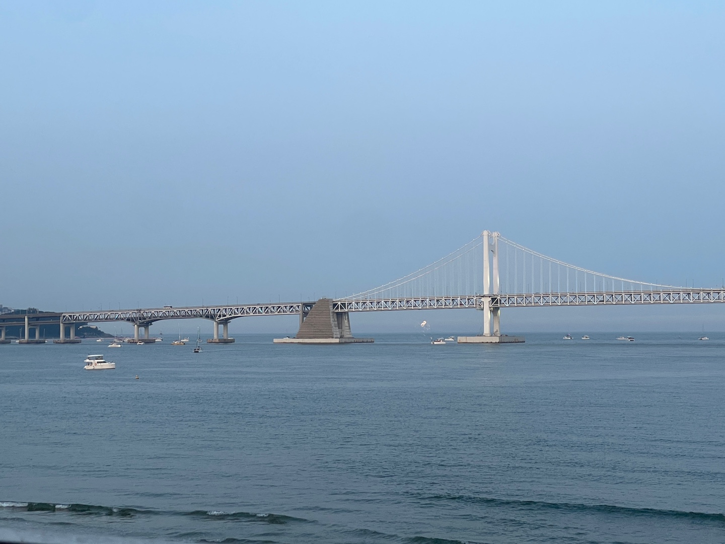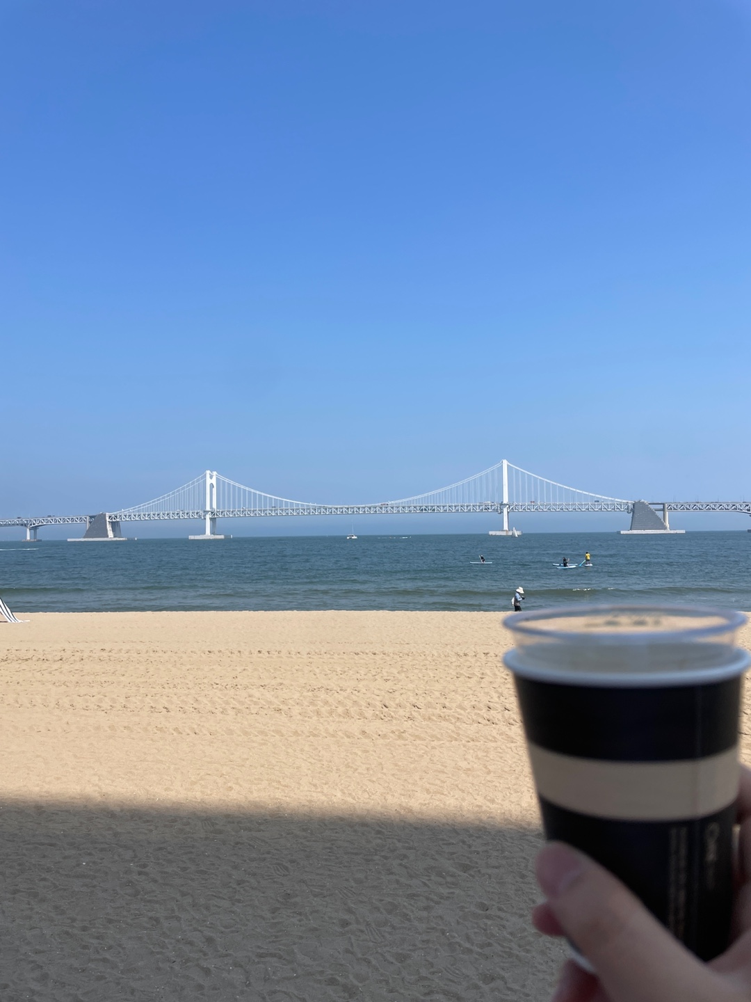 - 첫날 아침, 조용한 해변에 앉아 커피 한 잔과 함께 바라본 광안대교.